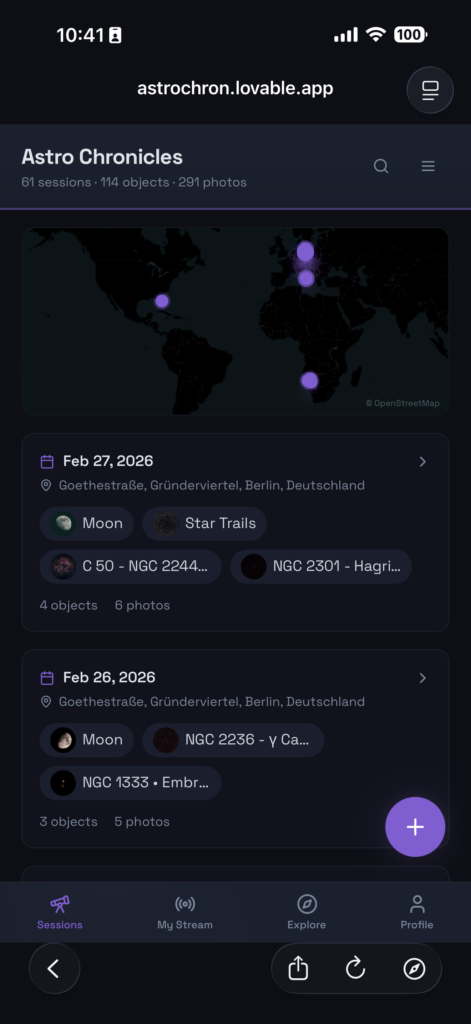 At its core, Astro Chronicles is a session-based photo organizer designed specifically for astrophotography. You upload your photos, and the app reads the EXIF metadata — date, time, GPS coordinates, camera model, exposure settings, focal length, ISO — and automatically groups them into photo sessions by date. No manual sorting required. Each session contains one or multiple objects, e.g. planets, the moon, galaxies, nebulas, or other objects.