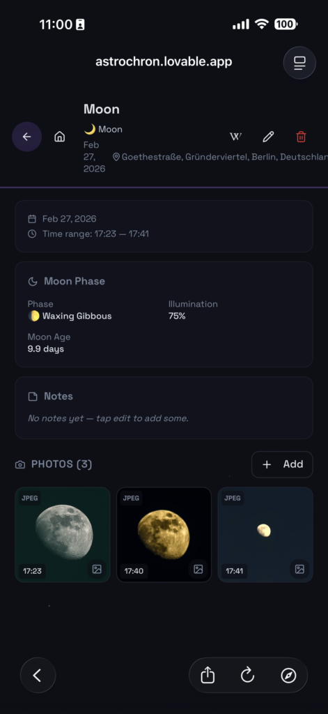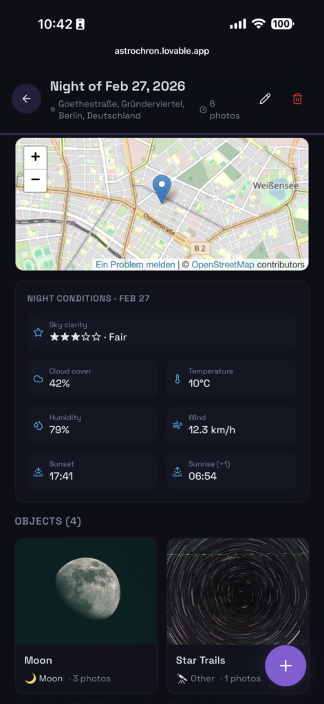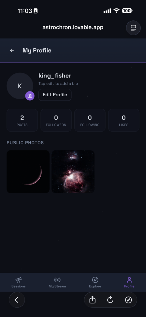 The whole app is AI-generated, and still very much a work in progress. The object identification is entirely manual — there’s no plate-solving or automated star detection. The weather and moon phase lookups depend on having accurate GPS and date metadata in your photos. The community features are basic. There’s no image stacking, no processing pipeline, no integration with tools like PixInsight or Siril.